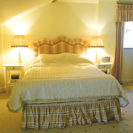 I can make any shape or size headboard that you wish. It could be buttoned, piped or left plain. It is usually fitted to the bed by wooden headboard struts. A bedroom which has beautifully made curtains, a bed valance, headboard and some cushions on the bed with fabrics that tie in perfectly together must surely aid restful sleep.